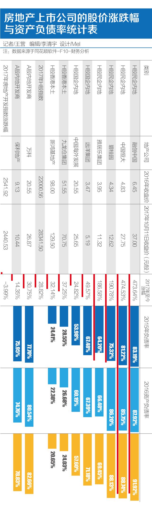 克而瑞分析师朱一鸣也具有相同看法。他认为,港股内房龙头股表现抢眼主要是由于经营业绩改善。从今年中报数据上看,像恒大、融创这些标志性房企盈利能力开始逐渐释放,负债率也开始下降,打消市场担忧(港股投资者较厌恶高风险)。此外,朱一鸣认为,房企集中度不断上升,分化加剧,资源向大房企倾斜,上市房企一般具有融资优势,规模一般也比较大。投资者对这样的预期更加突出。