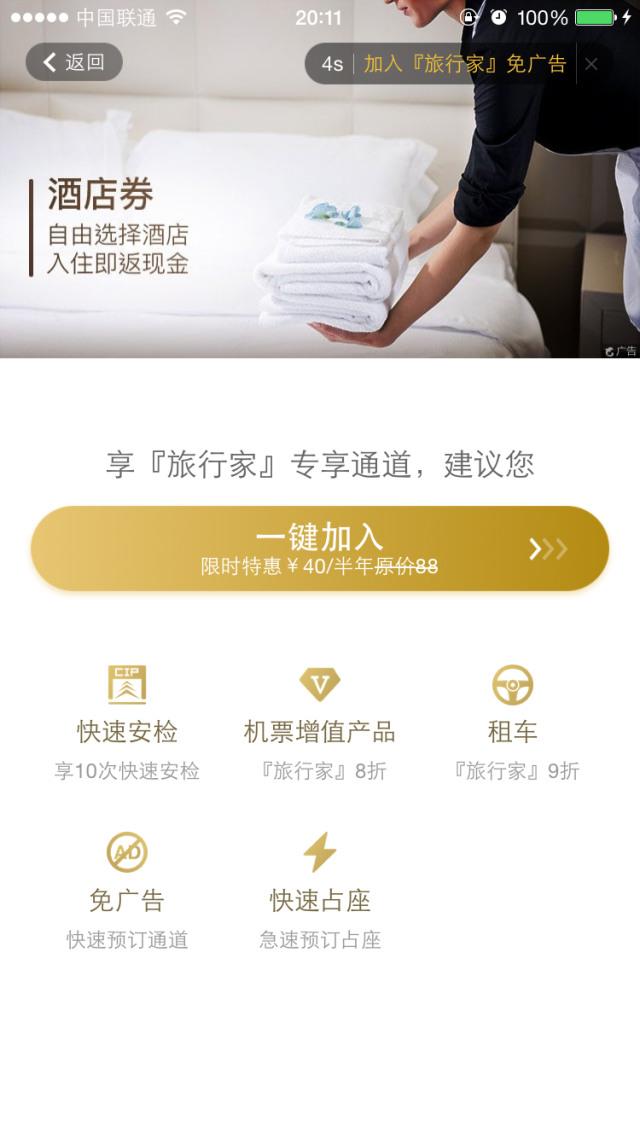 选择“普通预订”后,网站会弹出“是否残忍放弃优惠礼包”的提示,手机APP上则会弹出5秒的广告。