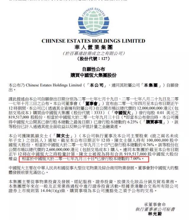 每日经济新闻(微信号:nbdnews)记者还注意到,陈凯韵还以26亿港元的总金额买入了1亿股中国恒大的股票。华人置业表示:“陈凯韵个人持股加上公司持股,陈凯韵被视为持有约9.2亿股中国恒大的股份,相当于中国恒大总股本的7%。”由于中国恒大的大股东是许家印,他持有中国恒大74.2%的股份,根据港交所的数据,陈凯韵为中国恒大的第二大股东。