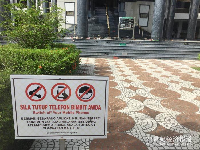 图为杰米清真寺。警示牌上指出,禁止在此捉“精灵”。