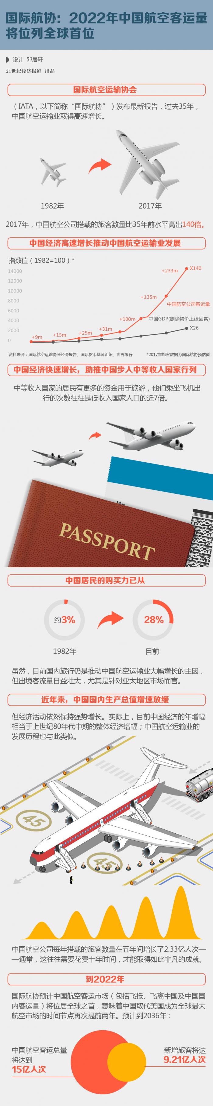 国际航空运输协会(IATA,以下简称“国际航协”)发布最新报告,过去35年,中国航空运输业取得高速增长。2017年,中国航空公司搭载的旅客数量比35年前水平高出140倍。