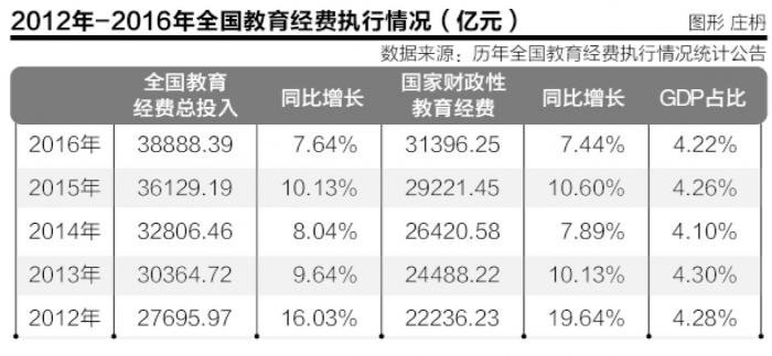 教育部、国家统计局、财政部近日发布了2016年全国教育经费执行情况统计公告。公告显示,2016年全国教育经费总投入为38888.39亿元。国家财政性教育经费为31396.25亿元,首次超过3万亿元,占GDP比例为4.22%。