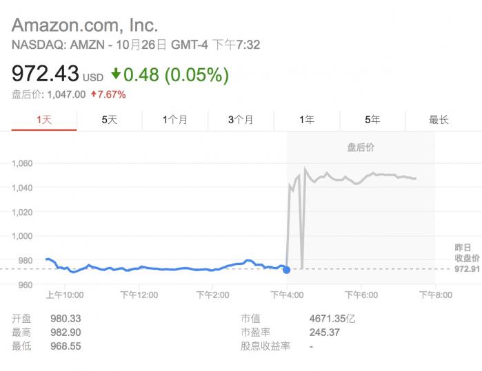 周四,亚马逊股价收于972.43美元。受强劲财报影响,截至当地时间19:30(北京时间27日7:30),亚马逊股价大幅上涨至1047.5美元,涨幅达7.72%。年初至今,亚马逊股价涨幅已达30%。