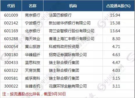 而通过上市公司三季报统计的QFII持股显示,截至三季度末,单个QFII机构持有流通股比例最高的前十大上市公司分别是南京银行、宁波银行、北京银行、海天味业、黄山旅游、华峰超纤、蓝思科技、天房发展、威孚高科、吉峰农机。持股比例从16%至3%不等。