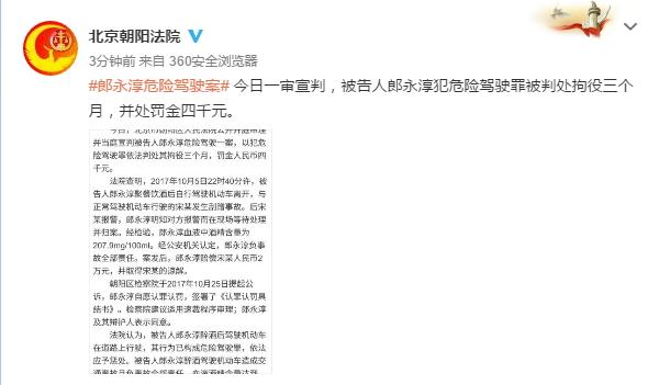 据北京朝阳法院官方微博发布,郎永淳危险驾驶案今日一审宣判,被告人郎永淳犯危险驾驶罪被判处拘役三个月,并处罚金四千元。