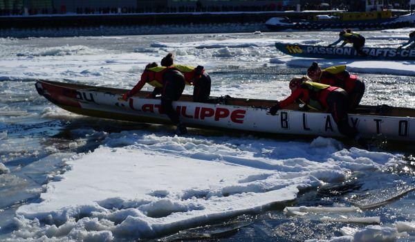 二月的圣劳伦斯河,浮冰互相挤撞,发出破碎的声音。偶尔出现在冬季阳光下的深蓝色河水,转眼就被浮冰覆盖。有时,大片的浮冰突然断裂,河水再次露出,一切在零下十几度的白色世界里看起来凶险而变幻莫测。可即便这样,眼前52支勇敢的划艇队伍还是从码头的起点开始拼命冲向冰河。