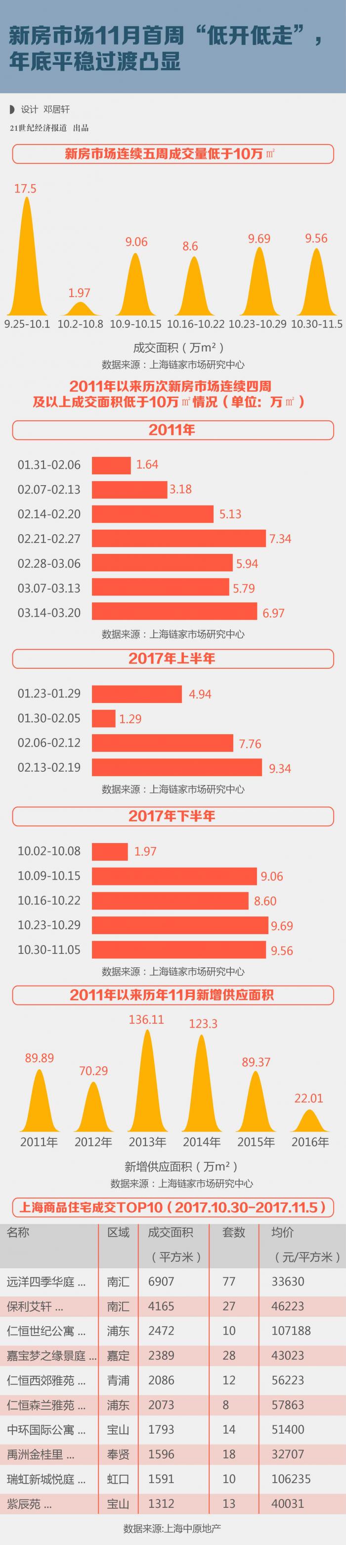根据上海链家市场研究中心监控数据显示,上周(2017.10.30-11.5)上海市新建商品住宅成交套数为720套,成交面积9.56万平方米,环比下跌1.37%。
