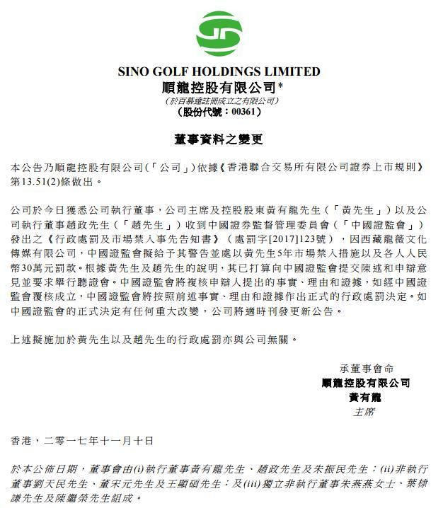 根据港股上市公司顺龙控股11月10日公告,在收到中国证监会的处罚告知书后,赵薇的丈夫黄有龙打算向证监会提交陈述和申辩意见,并要求举行听证会。