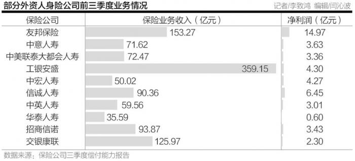 不过,中资保险公司的市场地位恐怕一时难以撼动。例如,外资保险公司在中国市场依然存在发展相对缓慢、份额占比较小等问题。根据21世纪经济报道记者统计,今年前三季度,在外资人身险公司中,工银安盛、恒大人寿、友邦保险、交银康联等保险业务收入破百亿,分别为359.15亿元、219.91亿元、153.27亿元和125.97亿元;友邦保险、恒大人寿、信诚人寿、工银安盛、中宏人寿等净利润排名靠前,分别为14.97亿元、13.15亿元、6.45亿元、4.30亿元和4.27亿元。