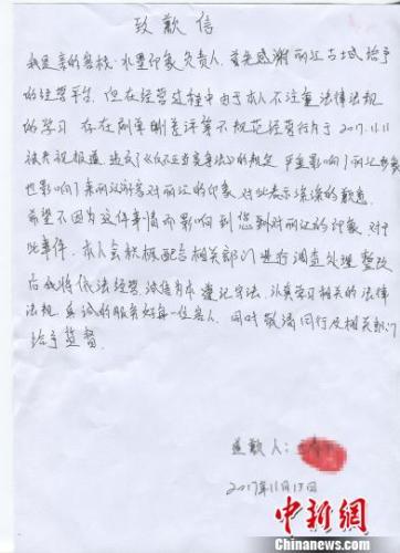 图为“风花雪月连锁客栈(初见店)”负责人的道歉信。 钟欣 摄