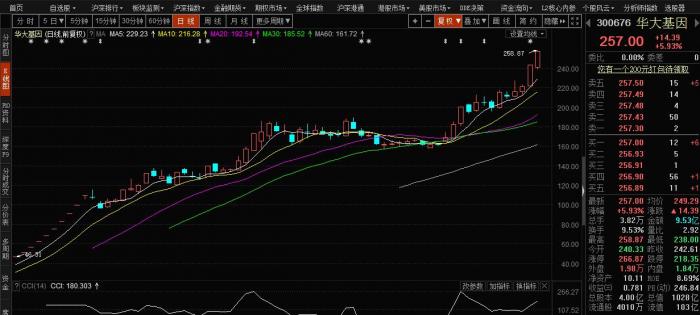 华大基因(300676)今日再度走强,盘中最高价报258.87元,市值1028亿元,在创业板中仅次于温氏股份,排名第二。截至发稿,该股报257元,涨5.93%。