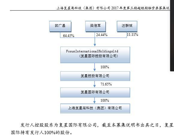 从复星系的一些披露文件中窥见一斑。据21世纪经济报道记者翻阅中国货币网上的复星高科2017年度第三期超短期融资券募集说明书显示,复星国际为复星控股有限公司持股71.65%的控股子公司,其余为社会公众持股,复星控股有限公司系根据香港特区法律成立的有限公司。截至该募集说明书出具之日(2017年10月10日),复星控股有限公司是复星国际控股有限公司的全资子公司。复星国际控股有限公司系根据英属维京群岛法律成立的有限公司,复星国际控股有限公司的股东为郭广昌、梁信军、汪群斌三位自然人。郭广昌持有复星国际控股有限公司64.45% 的股份,因此,复星高科的实际控制人为自然人郭广昌。