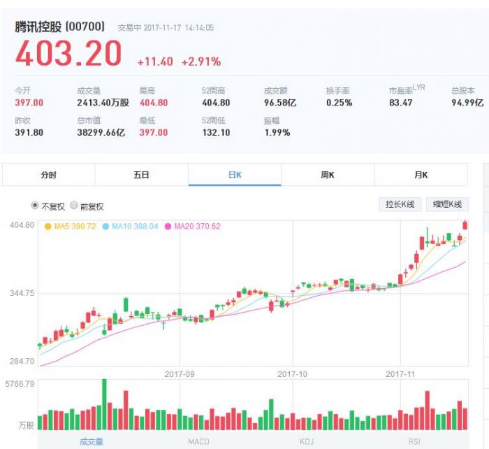 11月17日,腾讯今日股价上涨,一度超过400港元,市值超过3.8万亿港元,成为亚洲市值最高的公司。截至目前,腾讯控股报403.2港元,上涨2.91%。