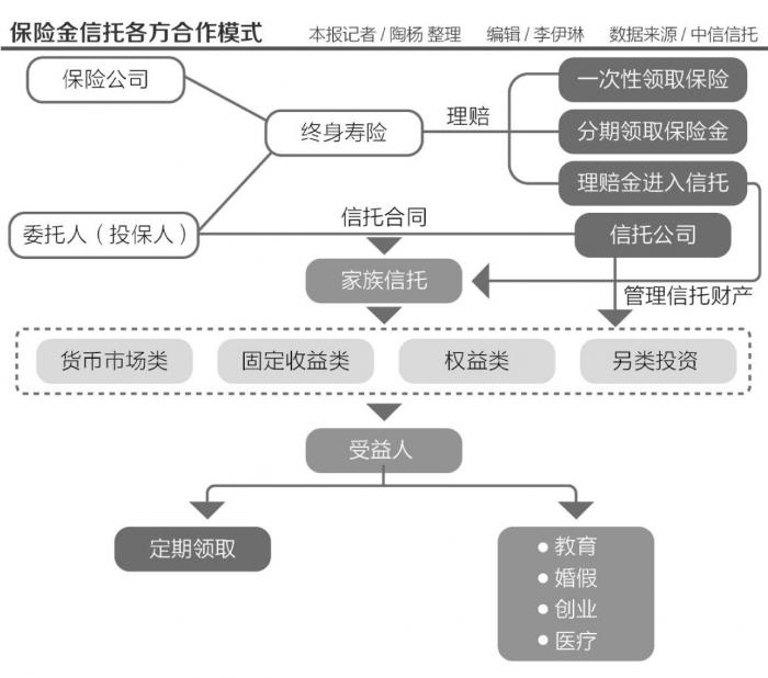 根据21世纪经济报道记者了解,为满足客户多样化需求,目前保险金信托已经升级出诸多模式。其中较为主流的模式是先订立保险合同,再订立信托合同,并将保单受益人变更为信托受托人,在保险金理赔后,信托公司受托负责后续管理和分配。