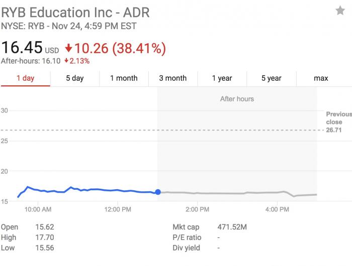 当地时间25日收盘,红黄蓝(NYSE:RYB)暴跌38.41%,报16.45美元,市值缩水约2.9亿美元,折合人民币接近19.4亿元。尽管如此,收盘价仍然比开盘价15.56美元要高,也就是说,日间仍然有买盘出现。
