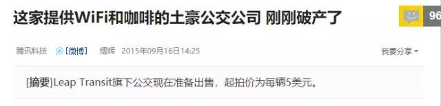 每经小编(微信号:nbdnews)随手搜索“共享巴士”,发现新闻大多都停留在2015年,当时阿里和滴滴均砸钱进入这个行业。可“共享巴士”在2015年后就很少再有相关动态,而提供豪华定制公交服务的初创公司Leap Transit更是在2015年申请破产。