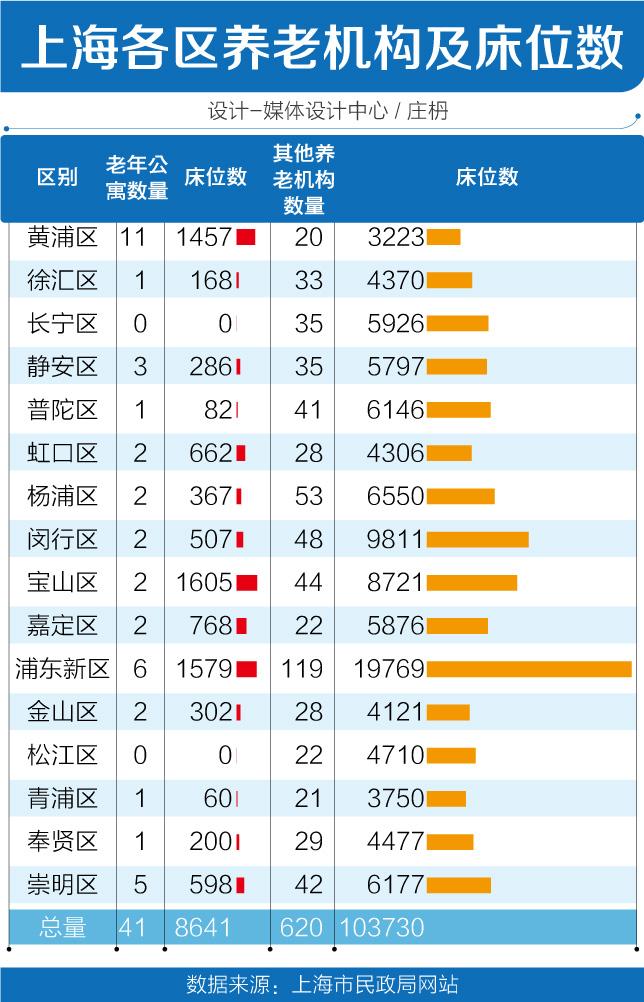 21世纪经济报道记者统计上海民政局网站上的养老机构公开数据发现,养老公寓共有41家,核定床位数位8641个;而其他福利院、养老院与敬老院等机构620家,核定床位数达到103730个。从数量上来看,养老公寓占比仅为6.6%。