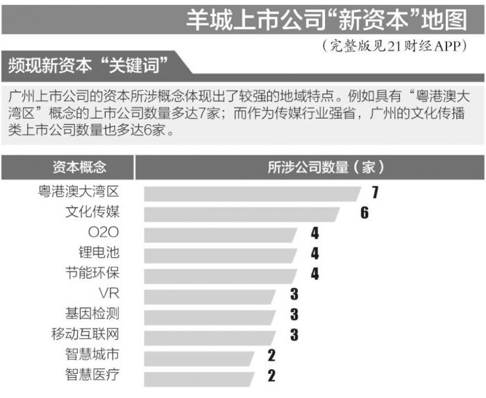广州99家上市公司中,合计有超过20家公司分别涉足了人工智能、智慧城市、物联网、智能医疗、智能交通、车联网等智能+新经济领域,概念股领域,O2O、VR、基因检测、移动互联网等多个资本热门概念云集。