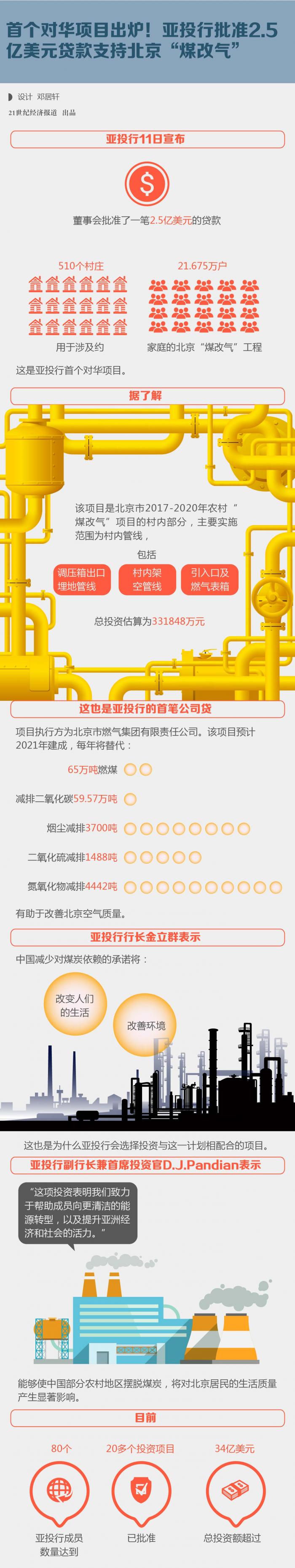 亚投行11日宣布,董事会批准了一笔2.5亿美元的贷款,用于涉及约510个村庄、21.675万户家庭的北京“煤改气”工程。这是亚投行首个对华项目。