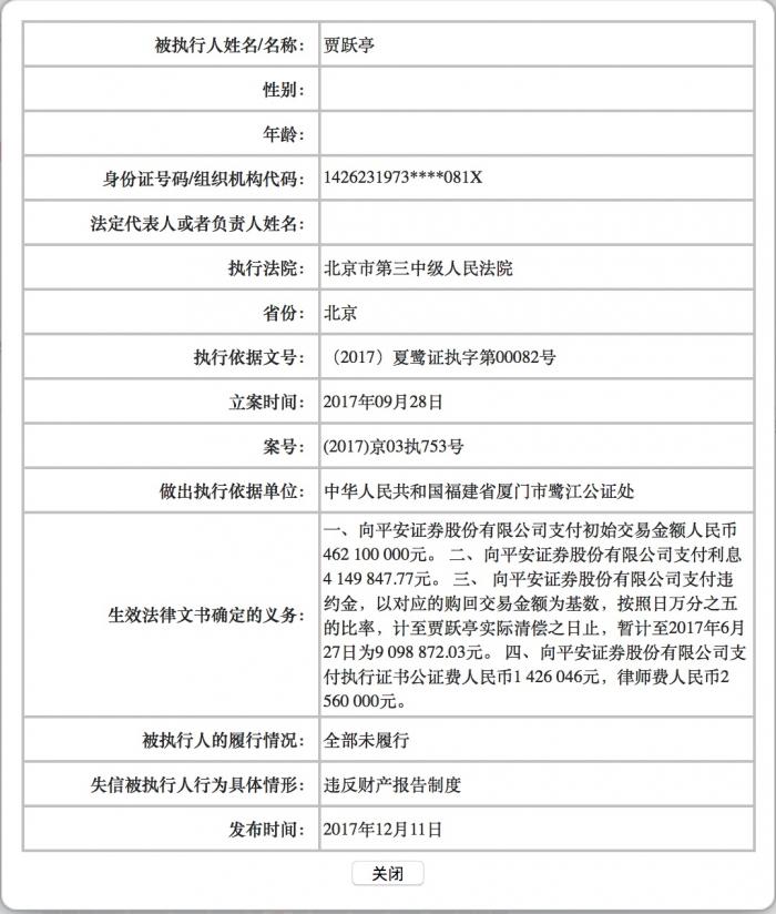 根据法院公开被执行人信息显示,贾跃亭未履行生效法律义务包括四项,向平安证券股份有限公司支付初始交易金额人民币4.621亿元;向平安证券股份有限公司支付利息4149847.77元;向平安证券股份有限公司支付违约金,以对应的购回交易金额为基数,按照日万分之五的比率,计至贾跃亭实际清偿之日止,暂计至2017年6月27日为9098872.03元。向平安证券股份有限公司支付执行证书公证费人民币1426046元,律师费人民币2560000元。