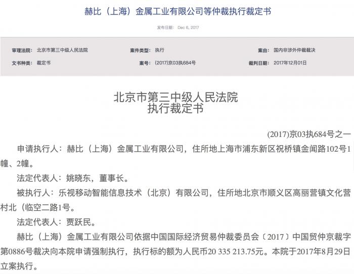 就在上周,乐视移动智能信息技术(北京)有限公司刚刚被列为失信被执行人。该案件的申请执行人为赫比(上海)金属工业有限公司,被执行人为乐视移动,该公司的法定代表人为贾跃亭的哥哥贾跃民,赫比金属执行标的额为人民币2033.5213万元。法院于2017年8月29日立案执行。北京市第三中级人民法院于2017年10月24日扣划了被执行人名下银行存款194.4745万元并发还申请执行人。