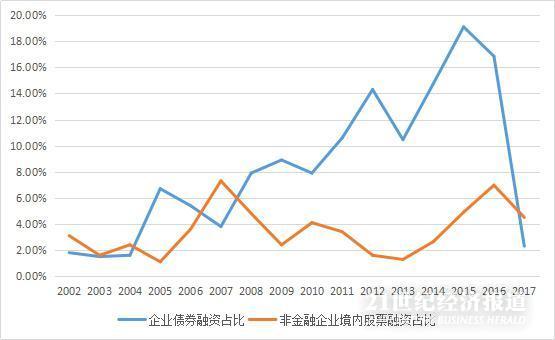 自2008年至2016年,债券融资规模一直超过股票融资。2012年以来,债市融资新增规模占比超股票融资的比例往往多达近10个百分点,2015年最高达14%。