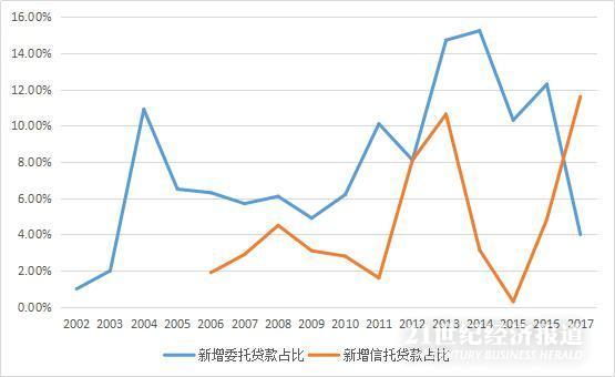 2017年,委托贷款增加7770亿元,同比少增1.41万亿元;信托贷款增加2.26万亿元,同比多增1.4万亿元。新增社会融资规模中,新增信托贷款占比高达11.6%,达到有统计数据以来的新高。新增委托贷款占比则从2016年的12.28%大幅度萎缩至4%,创下2004年以来新低。