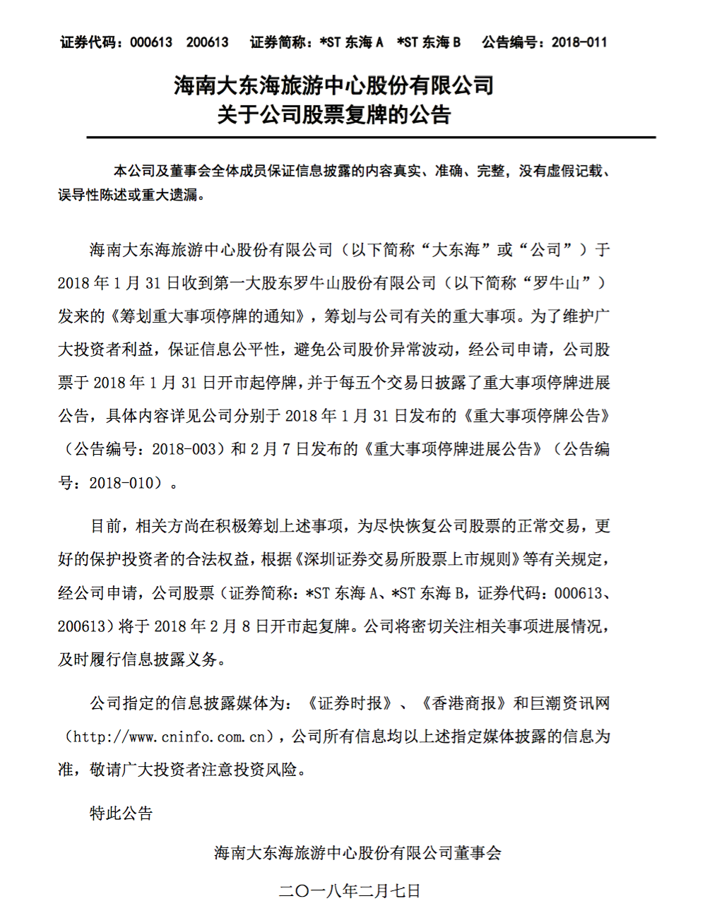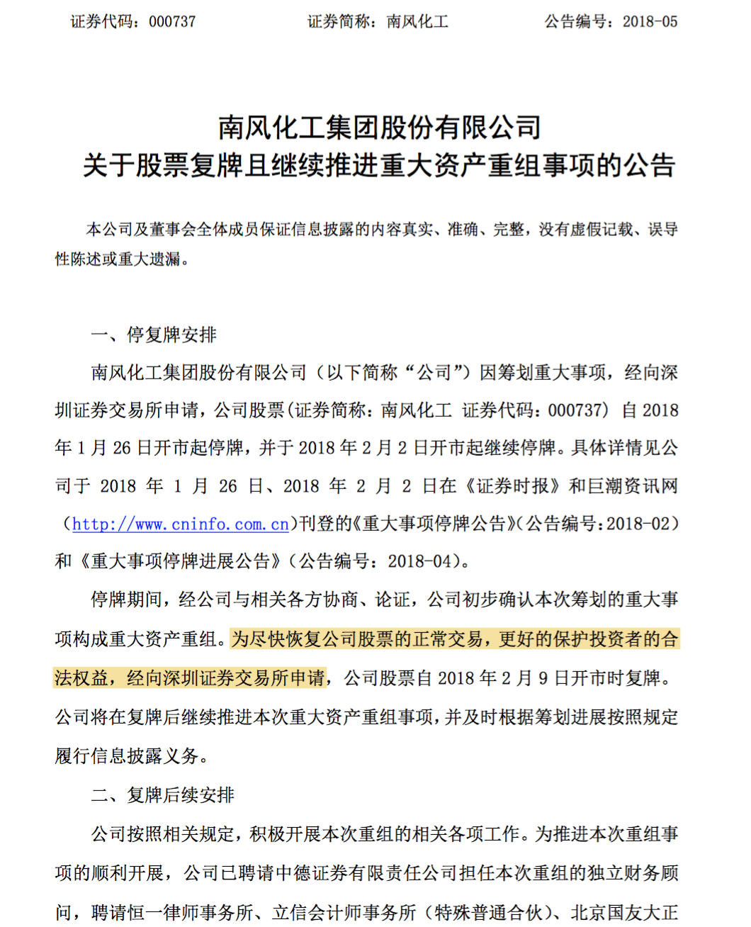 其中两份公告阐述复牌的原因,值得我们关注。*ST东海A与南方化工均提到“为尽快恢复公司股票的正常交易,更好的保护投资者的合法权益”。