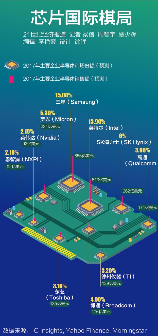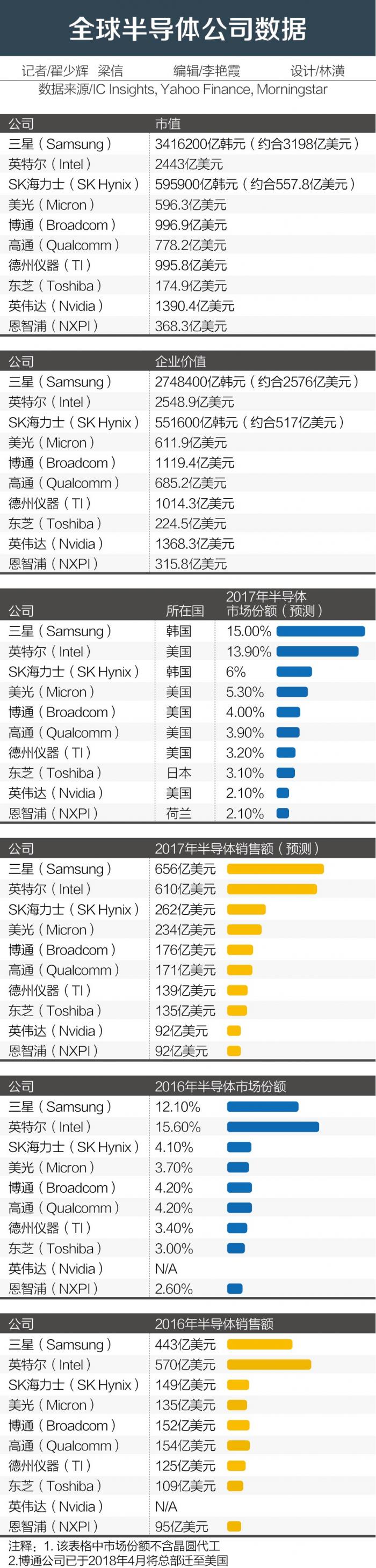 据半导体行业分析机构IC Insights于2017年11月更新的预测显示,不计晶圆代工,以市占率衡量的2017年全球十大半导体企业中,美、韩企业分别占据(报告发布时博通总部尚位于新加坡)5个和2个席位,日本、新加坡和荷兰则分别有一家企业入围。而在2016年,美、韩则分别有4家、2家企业入围,其余4家分别来自新加坡、日本、荷兰、中国台湾。