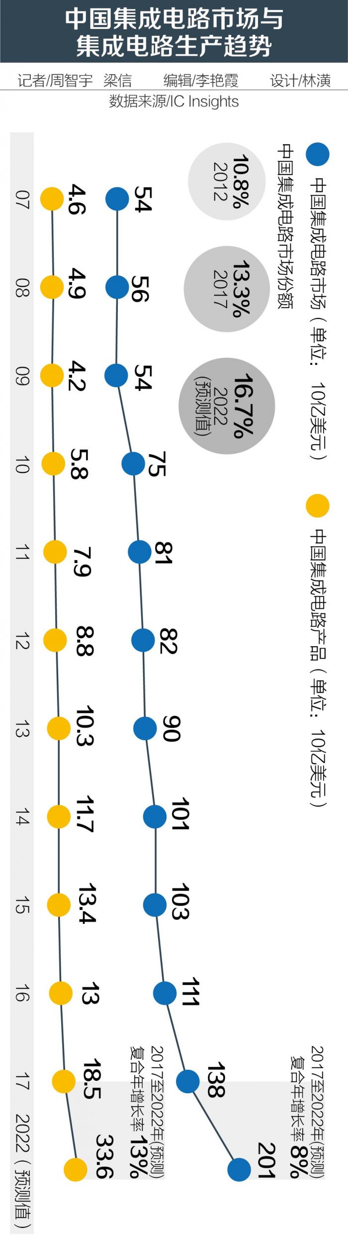 中国是全球半导体的主要消费国,出口产能却一直较低。根据中国海关总署数据,2017年中国集成电路年进口额约合2601亿美元,这一数字超过石油进口总金额,但2017年仅出口669亿美元。