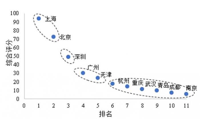 这份《研究》对国内部分城市的对外开放水平进行了一次综合评分,排名结果显示,上海、北京、深圳位居前三;广州处于第四;随后的城市则依次为天津、杭州、重庆、武汉、青岛、成都和南京。