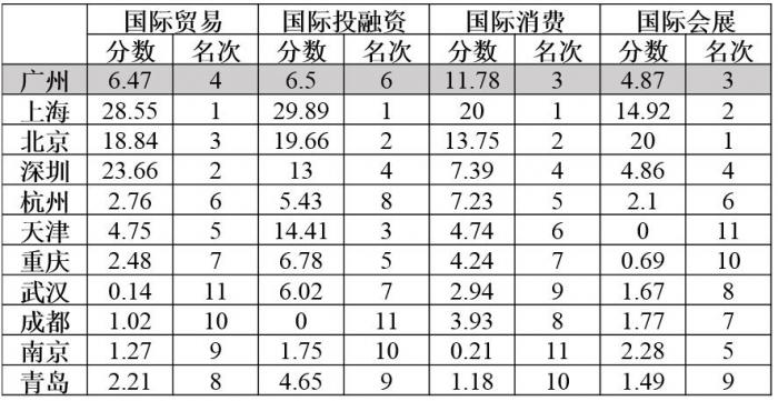 从分项评分可以更清晰看到广州对外开放的情况。《研究》显示,广州在国际贸易方面排名第四,前三名分别为上海、深圳和北京;而在国际投融资方面排名第六,落后于上海、北京、天津、深圳和重庆;国际消费方面则排名第三,仅次于上海和北京;国际会展方面亦排名第三,仅次于北京和上海。