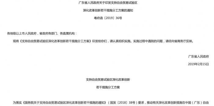 文末是《广东省人民政府关于印发支持自由贸易试验区深化改革创新若干措施分工方案的通知》链接: