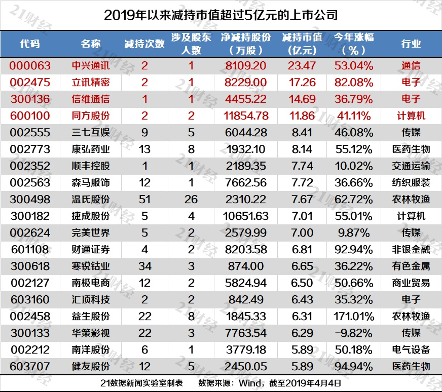 21数据新闻实验室统计显示,净减持市值超过10亿元的有中兴通讯(000063.SZ)、立讯精密(002475.SZ)、信维通信(300136.SZ)、同方股份(600100.SH)等4家;超过5亿元的有19家(见下表),超过1亿元的有125家(详表见文末)。