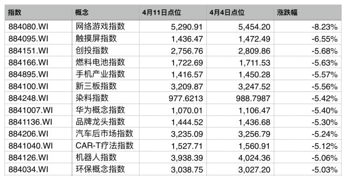 据Wind数据,21世纪经济报道记者统计发现,与上周最后一个交易日(4月8日)相比,不少热门板块跌势明显,网络游戏指数跌幅居首,为-8.23%,此前大热的触摸屏、创投、燃料电池、染料、华为概念、机器人板块跌幅均超过5%。