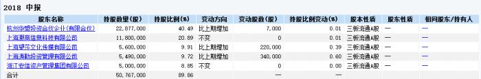 2018年半年报显示,华凯保险销售持股前五名股东中,华盟投资持有2287.7万股,占比为40.49%,为第一大股东;上海灏商信息科技有限公司持股占比为20.89%;上海望莎文化传媒有限公司持股占比9.91%;上海涛勤投资持股占比为9.72%;浙江安信资产管理集团有限公司持股比例8.85%,为第五。