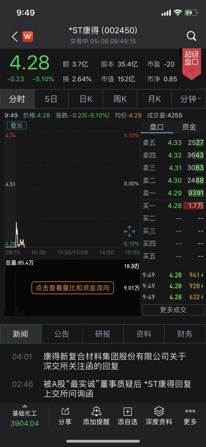 5月8日,*ST康得(002450.SZ)股价在6个交易日内收获第5个跌停,截至记者发稿,报4.28元。