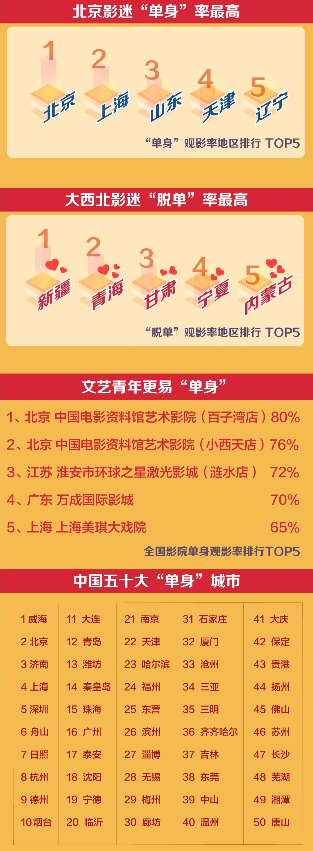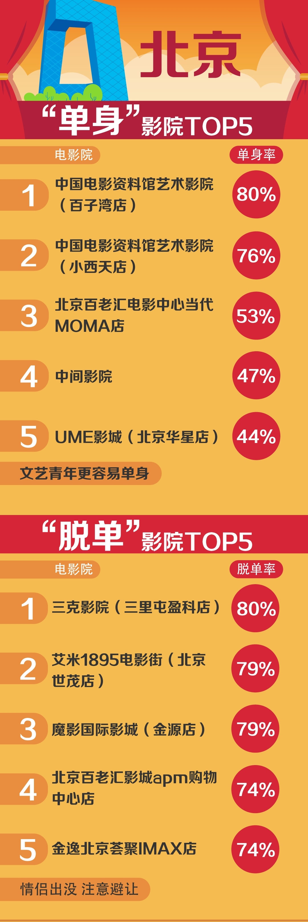 以放映艺术电影著称的中国电影资料馆艺术影院,在北京有两家影城,中国电影资料馆艺术影院(百子湾店)和中国电影资料馆艺术影院(小西天店),他们“单身率”高达80%和76%,跻身作为北京“单身“影院TOP5的前两家,