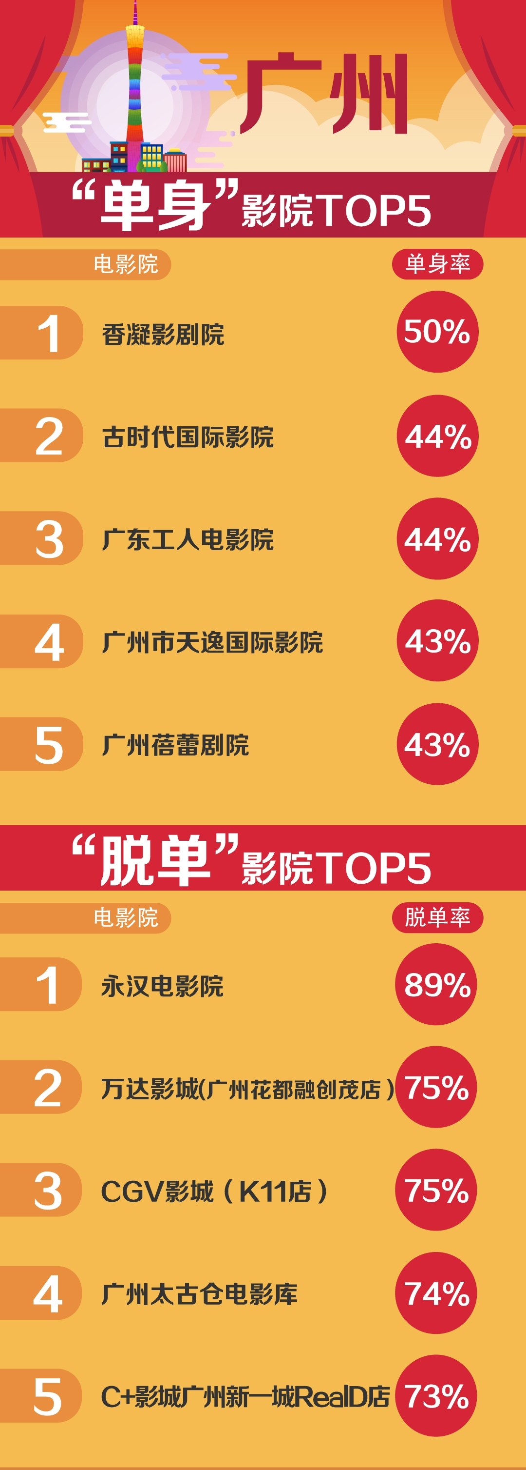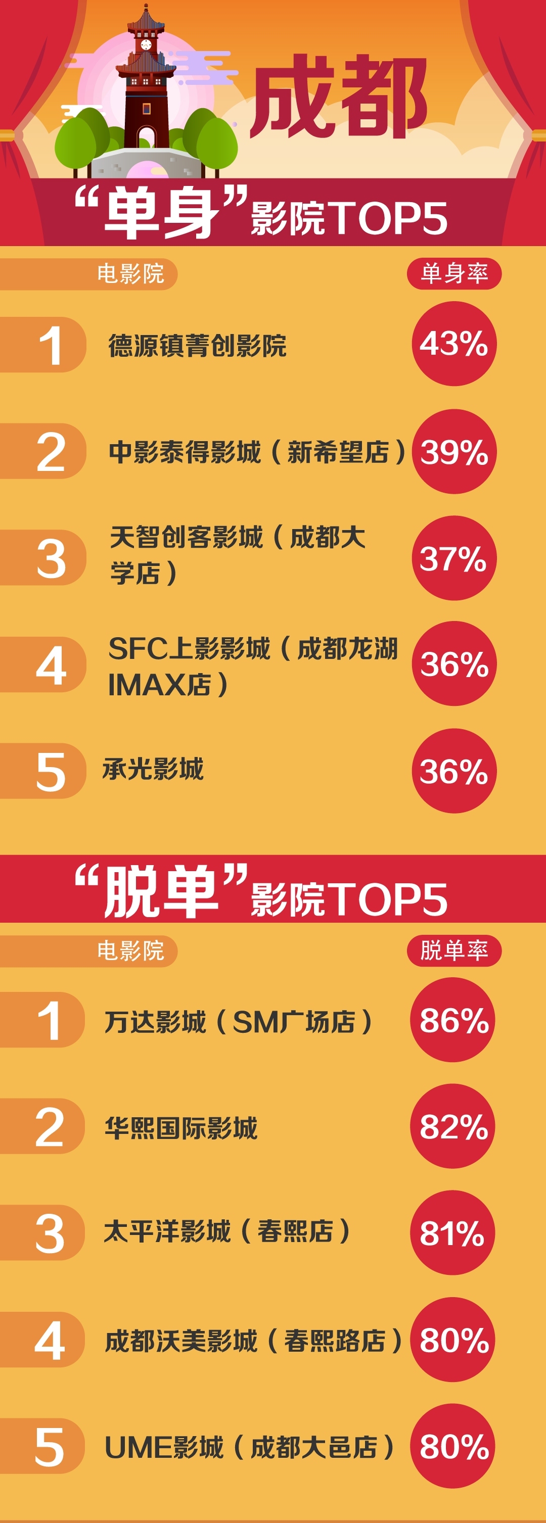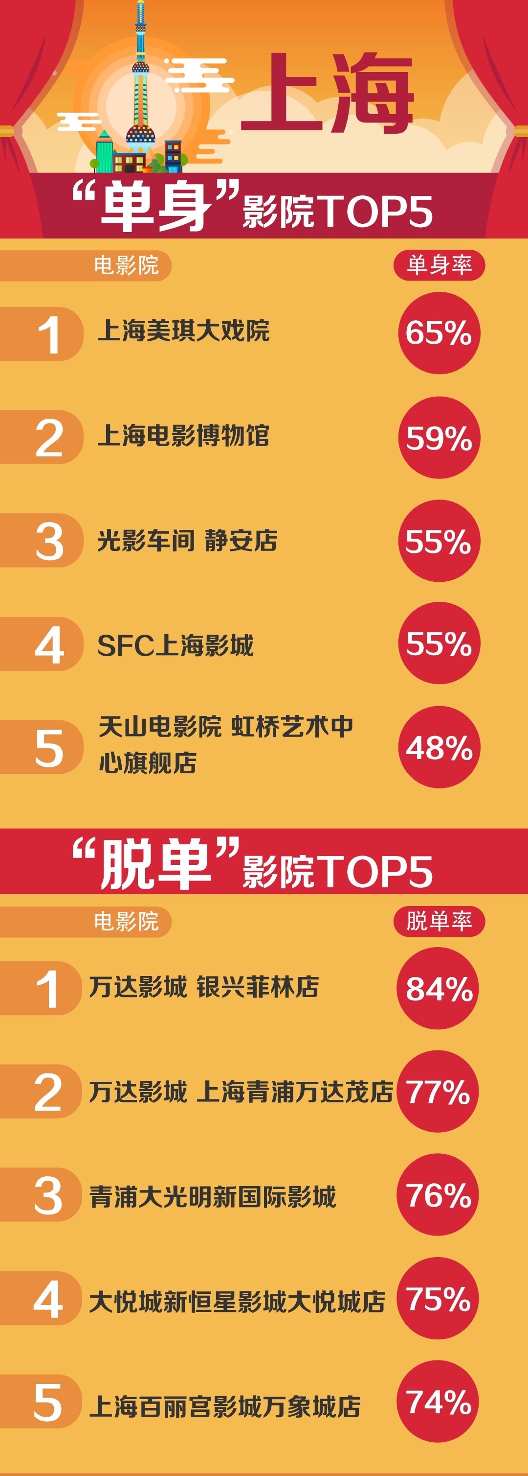 也许是偏爱文艺片的文艺青年多思敏感,淘票票数据显示,北京的两家中国电影资料馆艺术影院包揽了“单身”率电影院 TOP5的前两名,前往两家影院观影的用户中有将近8成都是一个人前来观影。而一个人的“冷清”不同,两人以上的结伴观影通常会选择热闹繁华的商圈,北京TOP5 的“脱单”影院几乎全部坐落在大型商超里。