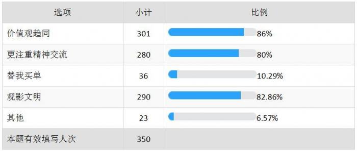 但同时,文艺青年并没有严苛的“择友“标准,“价值观趋同”、“良好的精神交流”和“文明观影”成为文艺青年寻找观影伴侣的三大条件。