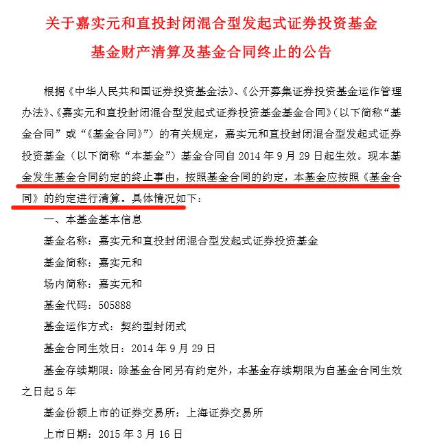 公告指出,根据《基金合同》规定,“本基金所持有的目标公司权益在《基金合同》期限届满前全部变现”,是本基金合同终止事由的情形之一,应按照本基金合同的约定进行清算。而目前嘉实元和所持有的目标公司权益现已全部变现,按照基金合同的上述约定,属于应当终止基金合同事由,应当按照基金合同的约定进行清算。