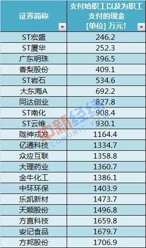 有对员工出手阔绰的上市公司,也有略显寒酸的上市公司。中新经纬梳理发现,2019年上半年,ST宏盛、ST厦华“携手”垫底,支付给职工以及为职工支付的现金分别为246.2万元和252.3万元。