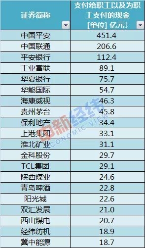 Wind显示,截至8月16日15:00,2019年上半年,已经发布半年报的648家A股公司支付给职工以及为职工支付的现金总和为2661.7亿元,前三名中国平安、中国联通、平安银行均超过百亿元,其中,中国平安为员工发放工资451.4亿元,遥遥领先。
