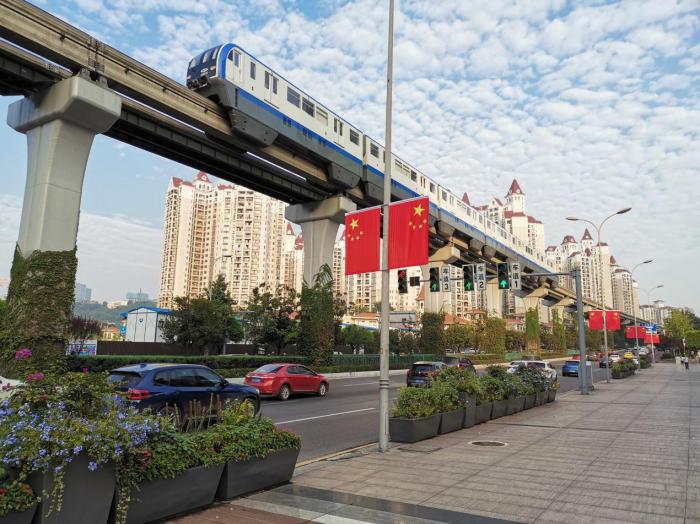 英雄城市、网红旅游地重庆,处处都是“中国红”,从9月下旬开始,鲜艳的五星红旗、红色的庆祝标语、美丽的花卉造型,大街小巷、各企事业单位和学校、高楼大厦及标志性建筑纷纷换上“红装”,人们用各种方式表达爱国情怀,“歌唱我们亲爱的祖国,从今走向繁荣富强……”