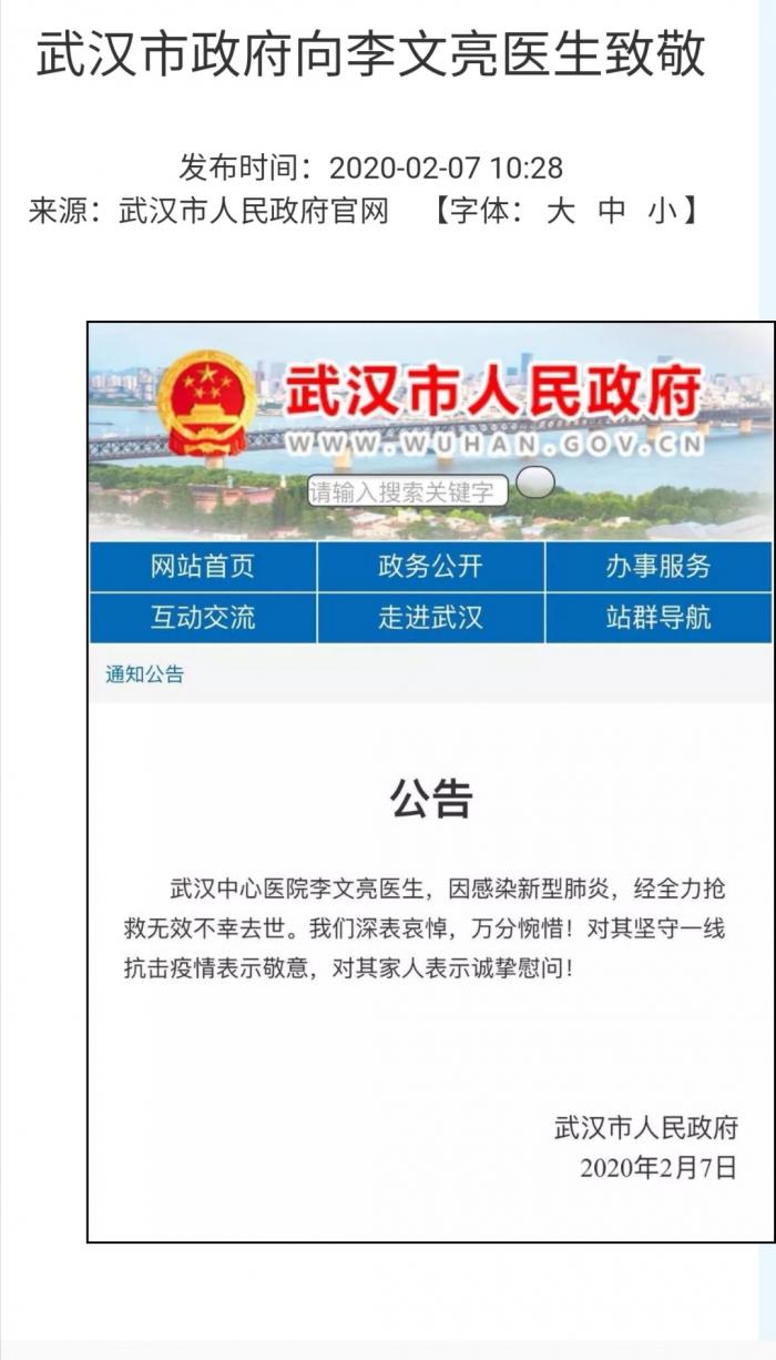 在武汉市人民政府官网上,2月7日10:28分,武汉市人民政府的公告显示,武汉中心医院李文亮医生,因感染新型肺炎,经全力抢救无效不幸去世。我们深表哀悼,万分痛惜!对其坚守一线抗击疫情表示敬意,对其家人表示诚挚慰问。