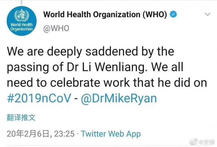当地时间2月6日,世界卫生组织发文表示,对于李文亮医生的去世感到悲痛。“我们所有人都应当赞美他就新型冠状病毒疫情所做的工作。 ”