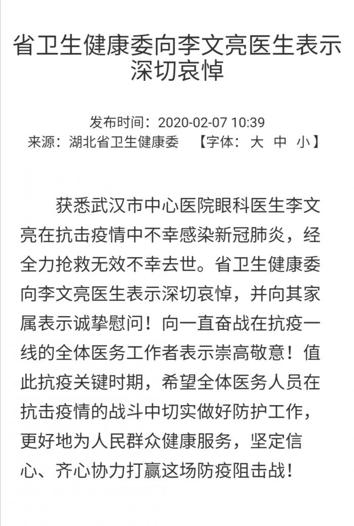 2月7日,湖北省人民政府网站上,湖北省卫生健康委发文向李文亮医生表示深切哀悼。