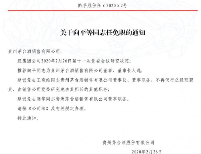 3月6日,一份名为黔茅股份任(2020)2号文的文件被公开披露,内容为茅台酒销售公司董事长由贵州茅台集团营销有限公司(下称茅台集团营销公司)党委书记、董事长向平担任。