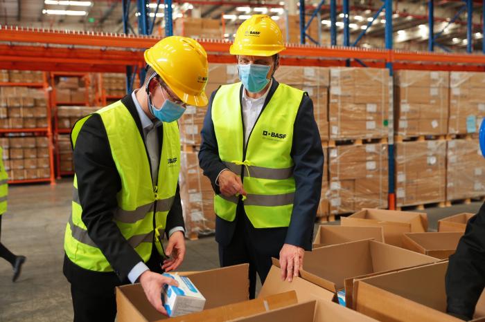 巴斯夫亚太区采购部副总裁凯诺博(左)与柯迪文检查口罩。 图片来源:巴斯夫
