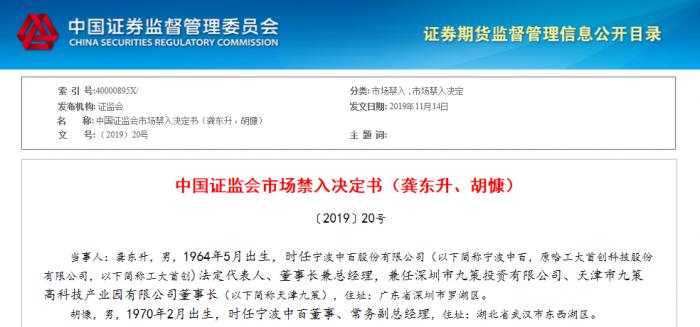 中国证监会2019年11月14日一则市场禁入决定书不仅披露了“宁波中百当初是如何给天津九策做的担保”,同时也披露了龚东升在这次担保中扮演的“角色”。